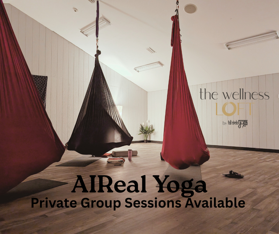 AIReal Yoga: Schedule a group private AIReal Yoga class for you, and up to 5 of your friends- contact Cheryl McHugh at fullcircleyogawv@yahoo.com for more information or to schedule.
